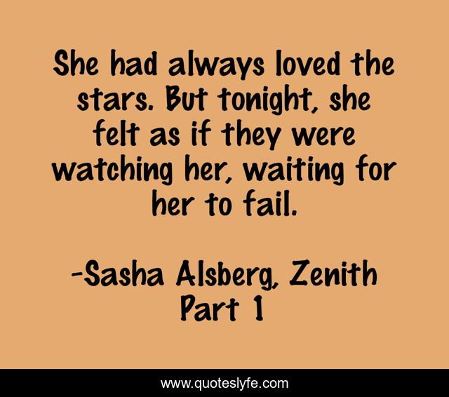 This page presents the quote "She had always loved the stars. But tonight, she felt as if they were watching her, waiting for her to fail.". Author of this quote is Sasha Alsberg, Zenith Part 1. This quote is about failure, stars, space,.