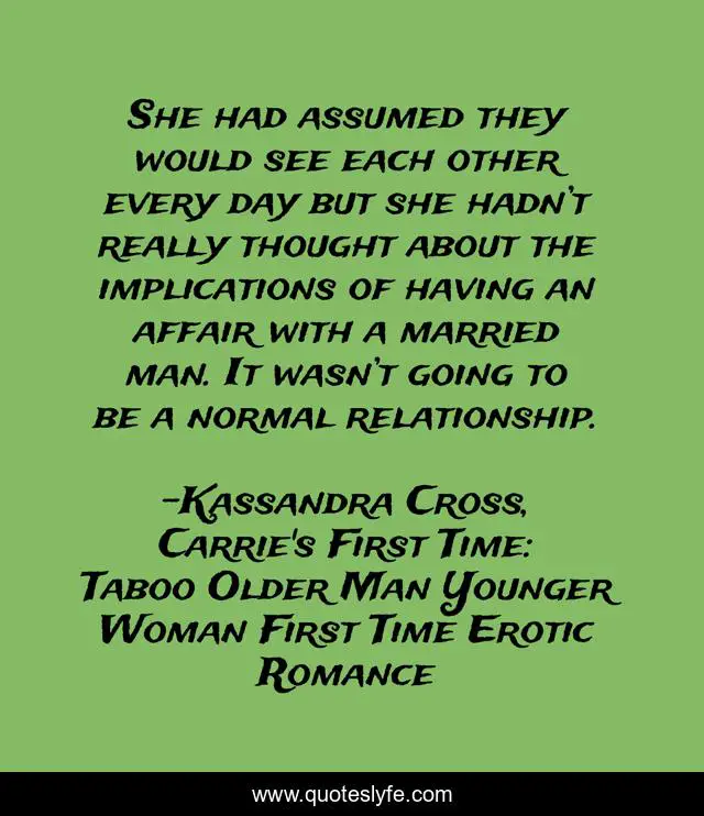 This page presents the quote "She had assumed they would see each other every day but she hadn’t really thought about the implications of having an affair with a married man. It wasn’t going to be a normal relationship.". Author of this quote is Kassandra Cross, Carrie's First Time: Taboo Older Man Younger Woman First Time Erotic Romance. This quote is about eroticism, affair, forbidden, forbidden-fruit, forbidden-love, erotica, realisation, affairs, cheating,.