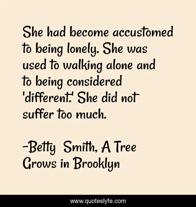 This page presents the quote "She had become accustomed to being lonely. She was used to walking alone and to being considered 'different.' She did not suffer too much.". Author of this quote is Betty Smith, A Tree Grows in Brooklyn. This quote is about loneliness, comfort, girls, suffering, inspirational, enthusiasm,.