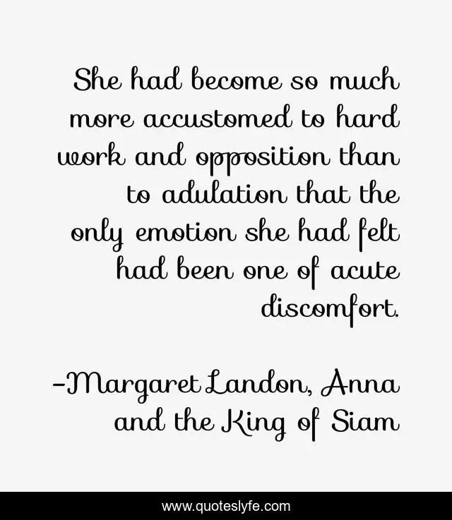 This page presents the quote "She had become so much more accustomed to hard work and opposition than to adulation that the only emotion she had felt had been one of acute discomfort.". Author of this quote is Margaret Landon, Anna and the King of Siam. This quote is about favor, praise, distraction,.