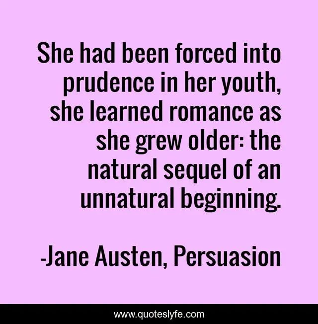 This page presents the quote "She had been forced into prudence in her youth, she learned romance as she grew older: the natural sequel of an unnatural beginning.". Author of this quote is Jane Austen, Persuasion. .