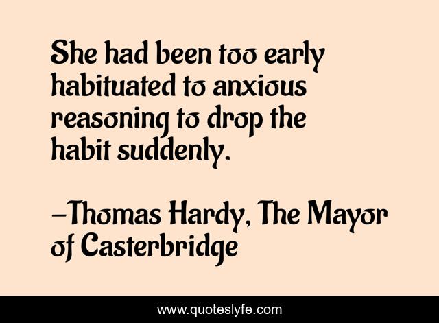 This page presents the quote "She had been too early habituated to anxious reasoning to drop the habit suddenly.". Author of this quote is Thomas Hardy, The Mayor of Casterbridge. This quote is about faith, anxiety, conditioning, worry, habit,.