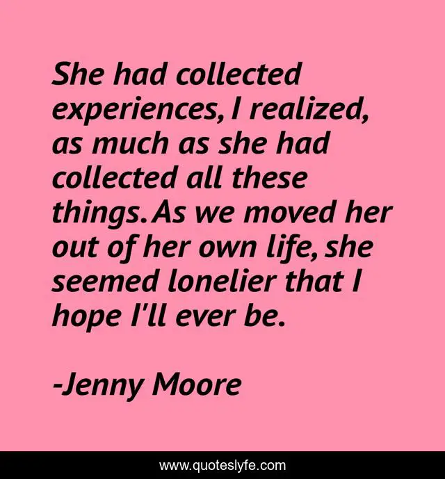 "Jenny Moore Quotes." Quoteslyfe.com, 2025. Sat. 06 Dec. 2025. <https://www.quoteslyfe.com/quote/She-had-collected-experiences-I-realized-as-138917>.