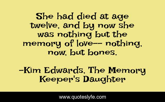 "Kim Edwards, The Memory Keeper's Daughter Quotes." Quoteslyfe.com, 2025. Fri. 05 Dec. 2025. <https://www.quoteslyfe.com/quote/She-had-died-at-age-twelve-and-21518>.
