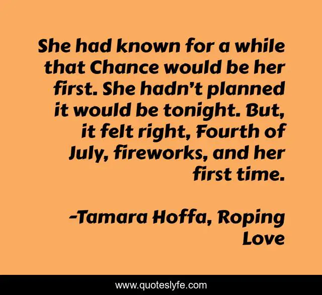 This page presents the quote "She had known for a while that Chance would be her first. She hadn’t planned it would be tonight. But, it felt right, Fourth of July, fireworks, and her first time.". Author of this quote is Tamara Hoffa, Roping Love. .