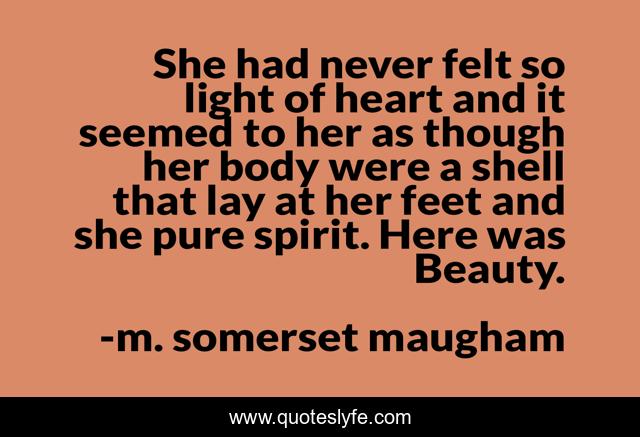 This page presents the quote "She had never felt so light of heart and it seemed to her as though her body were a shell that lay at her feet and she pure spirit. Here was Beauty.". Author of this quote is m. somerset maugham. This quote is about beauty, happiness,.