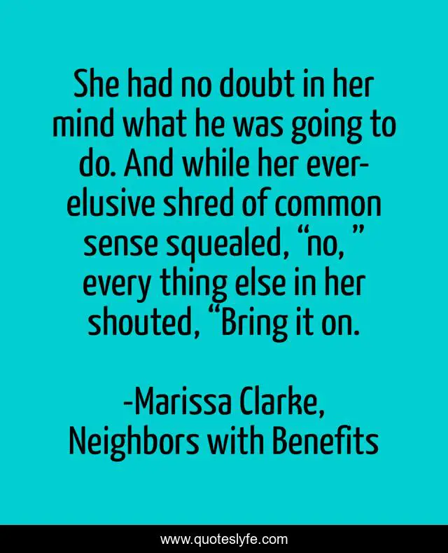 This page presents the quote "She had no doubt in her mind what he was going to do. And while her ever-elusive shred of common sense squealed, “no, ” every thing else in her shouted, “Bring it on.". Author of this quote is Marissa Clarke, Neighbors with Benefits. This quote is about category-romance, contemporary-romance, lovestruck, entangled,.