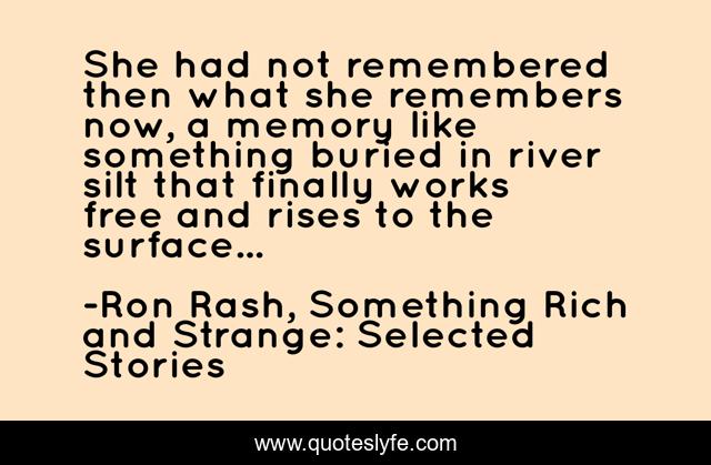 This page presents the quote "She had not remembered then what she remembers now, a memory like something buried in river silt that finally works free and rises to the surface...". Author of this quote is Ron Rash, Something Rich and Strange: Selected Stories. .