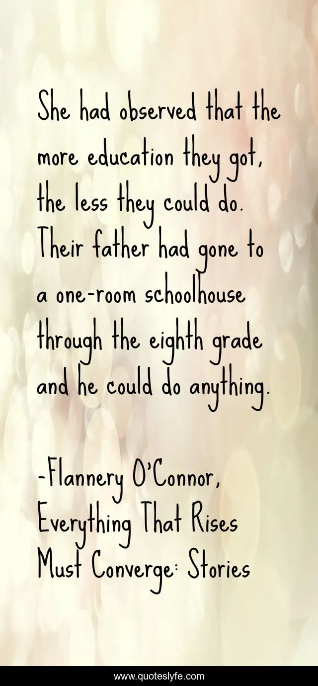 This page presents the quote "She had observed that the more education they got, the less they could do. Their father had gone to a one-room schoolhouse through the eighth grade and he could do anything.". Author of this quote is Flannery O'Connor, Everything That Rises Must Converge: Stories. .