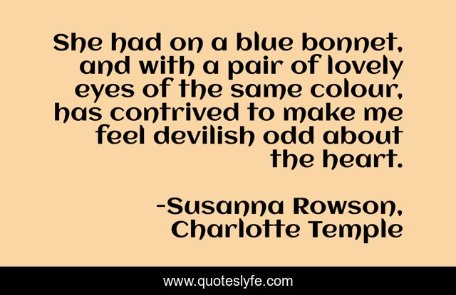 This page presents the quote "She had on a blue bonnet, and with a pair of lovely eyes of the same colour, has contrived to make me feel devilish odd about the heart.". Author of this quote is Susanna Rowson, Charlotte Temple. This quote is about heart, eyes, love, affection,.