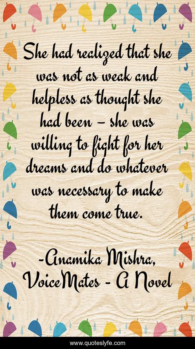 This page presents the quote "She had realized that she was not as weak and helpless as thought she had been – she was willing to fight for her dreams and do whatever was necessary to make them come true.". Author of this quote is Anamika Mishra, VoiceMates - A Novel. This quote is about confidence, positive, motivational, thoughts, inspirational, enthusiasm, dreams, optimistic,.