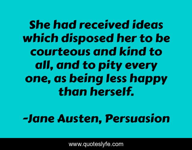 This page presents the quote "She had received ideas which disposed her to be courteous and kind to all, and to pity every one, as being less happy than herself.". Author of this quote is Jane Austen, Persuasion. .