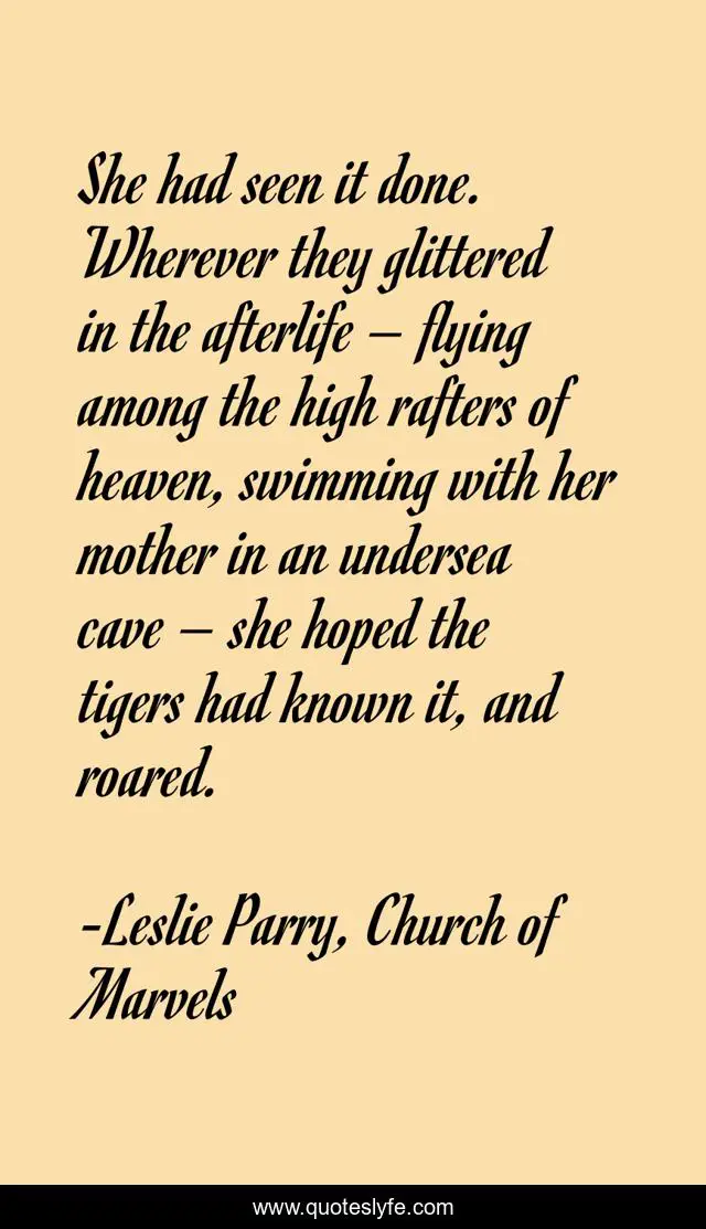 This page presents the quote "She had seen it done. Wherever they glittered in the afterlife – flying among the high rafters of heaven, swimming with her mother in an undersea cave – she hoped the tigers had known it, and roared.". Author of this quote is Leslie Parry, Church of Marvels. This quote is about carnivals, sideshows, family,.