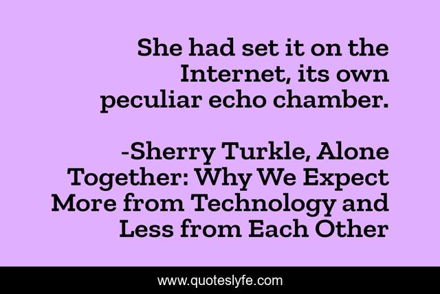 This page presents the quote "She had set it on the Internet, its own peculiar echo chamber.". Author of this quote is Sherry Turkle, Alone Together: Why We Expect More from Technology and Less from Each Other. This quote is about culture, reinforcement, social-networking,.