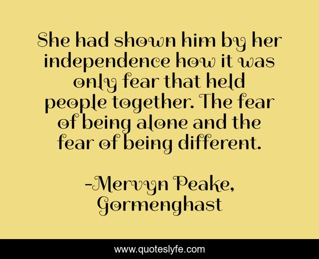 This page presents the quote "She had shown him by her independence how it was only fear that held people together. The fear of being alone and the fear of being different.". Author of this quote is Mervyn Peake, Gormenghast. This quote is about revolution, fears, independence,.
