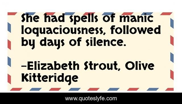 This page presents the quote "She had spells of manic loquaciousness, followed by days of silence.". Author of this quote is Elizabeth Strout, Olive Kitteridge. .