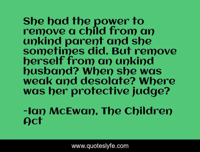 This page presents the quote "She had the power to remove a child from an unkind parent and she sometimes did. But remove herself from an unkind husband? When she was weak and desolate? Where was her protective judge?". Author of this quote is Ian McEwan, The Children Act. This quote is about judge, husband, child,.