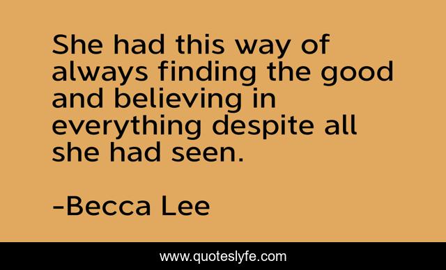 This page presents the quote "She had this way of always finding the good and believing in everything despite all she had seen.". Author of this quote is Becca Lee. This quote is about believing-in-miracles, finding-the-good-in-others, believing-in-others, hope,.