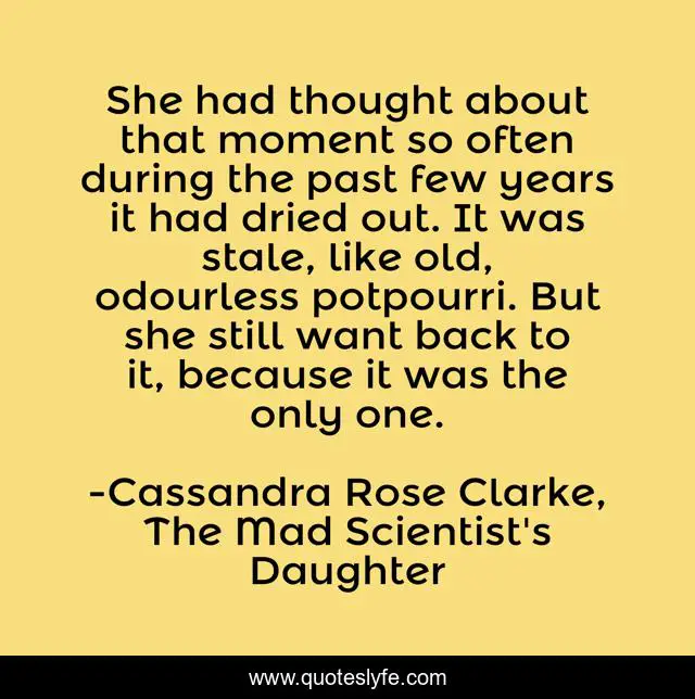 This page presents the quote "She had thought about that moment so often during the past few years it had dried out. It was stale, like old, odourless potpourri. But she still want back to it, because it was the only one.". Author of this quote is Cassandra Rose Clarke, The Mad Scientist's Daughter. This quote is about memories, memory, love, affection, pain,.