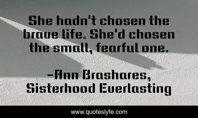 This page presents the quote "She hadn't chosen the brave life. She'd chosen the small, fearful one.". Author of this quote is Ann Brashares, Sisterhood Everlasting. This quote is about fearful, small, life, brave,.