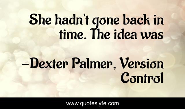 This page presents the quote "She hadn't gone back in time. The idea was". Author of this quote is Dexter Palmer, Version Control. This quote is about ripple-effect, butterfly-effect, time-travel, dexter-palmer, version-control, what-if,.