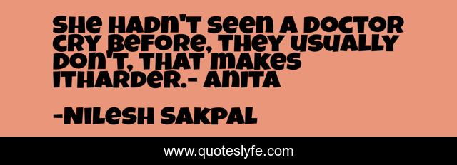 This page presents the quote "She hadn't seen a doctor cry before, they usually don't, that makes itharder.- Anita". Author of this quote is Nilesh Sakpal. This quote is about doctors, strength-through-adversity, emotions, women,.