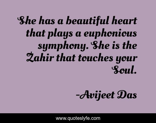 This page presents the quote "She has a beautiful heart that plays a euphonious symphony. She is the Zahir that touches your Soul.". Author of this quote is Avijeet Das. This quote is about heart, life, love, zahir, valentines, soul, writing, symphony, writers,.