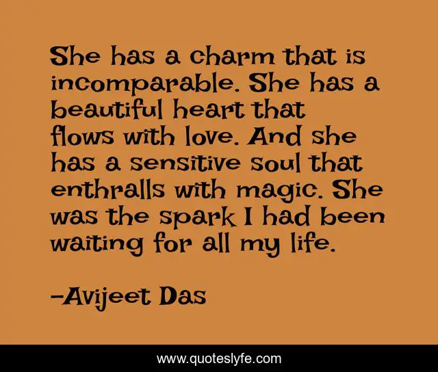 This page presents the quote "She has a charm that is incomparable. She has a beautiful heart that flows with love. And she has a sensitive soul that enthralls with magic. She was the spark I had been waiting for all my life.". Author of this quote is Avijeet Das. This quote is about heart, magic, love-poetry, valentines, soul, sensitive, charm, poetry-love, love,.