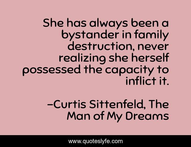This page presents the quote "She has always been a bystander in family destruction, never realizing she herself possessed the capacity to inflict it.". Author of this quote is Curtis Sittenfeld, The Man of My Dreams. This quote is about family, destruction,.