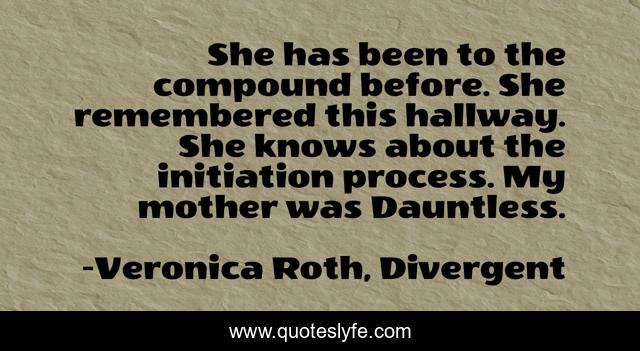 This page presents the quote "She has been to the compound before. She remembered this hallway. She knows about the initiation process. My mother was Dauntless.". Author of this quote is Veronica Roth, Divergent. This quote is about truth, women,.