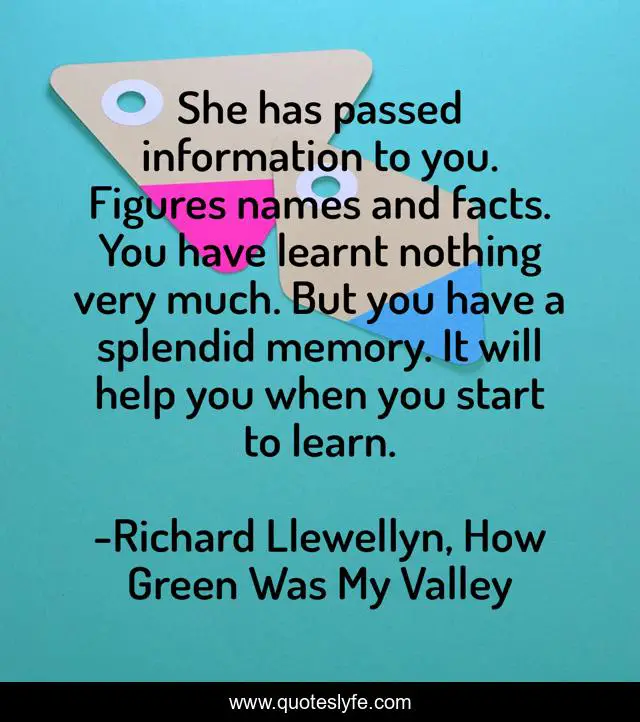 This page presents the quote "She has passed information to you. Figures names and facts. You have learnt nothing very much. But you have a splendid memory. It will help you when you start to learn.". Author of this quote is Richard Llewellyn, How Green Was My Valley. This quote is about facts, learning, memory,.
