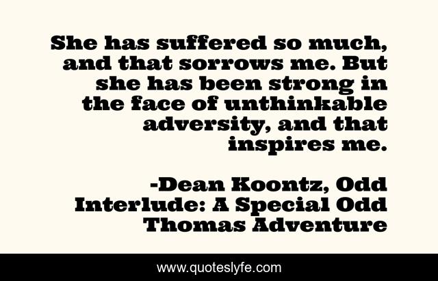 This page presents the quote "She has suffered so much, and that sorrows me. But she has been strong in the face of unthinkable adversity, and that inspires me.". Author of this quote is Dean Koontz, Odd Interlude: A Special Odd Thomas Adventure. This quote is about perceverance, suffering, sorrow-strength, odd-thomas, inspiration,.