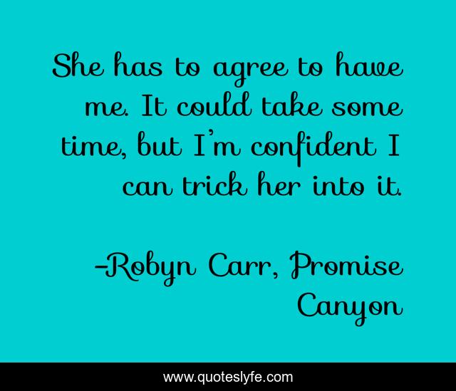 This page presents the quote "She has to agree to have me. It could take some time, but I’m confident I can trick her into it.". Author of this quote is Robyn Carr, Promise Canyon. This quote is about romance, funny, comedy, humour,.