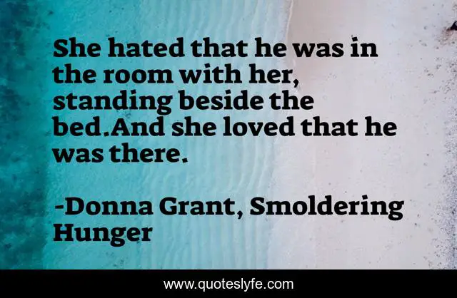 This page presents the quote "She hated that he was in the room with her, standing beside the bed.And she loved that he was there.". Author of this quote is Donna Grant, Smoldering Hunger. This quote is about dragon-kings, dragons, highlander-romance, scotish-romance, fae,.