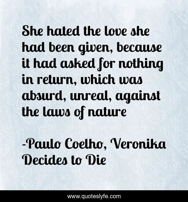 This page presents the quote "She hated the love she had been given, because it had asked for nothing in return, which was absurd, unreal, against the laws of nature". Author of this quote is Paulo Coelho, Veronika Decides to Die. This quote is about hate, love, affection,.