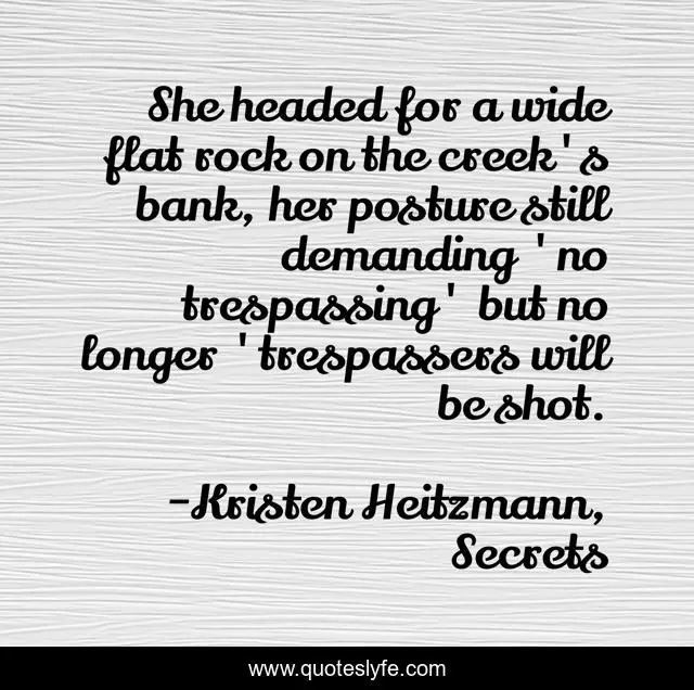 This page presents the quote "She headed for a wide flat rock on the creek's bank, her posture still demanding 'no trespassing' but no longer 'trespassers will be shot.". Author of this quote is Kristen Heitzmann, Secrets. This quote is about trespassing, friendship, humor,.