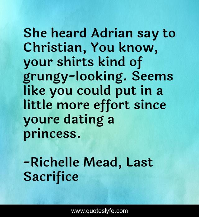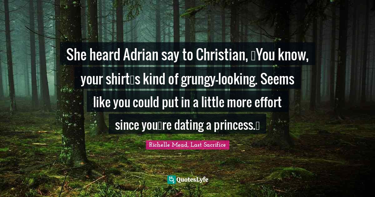 This page presents the quote "She heard Adrian say to Christian, ʺYou know, your shirtʹs kind of grungy-looking. Seems like you could put in a little more effort since youʹre dating a princess.ʺ". Author of this quote is Richelle Mead, Last Sacrifice. This quote is about christian, adrian,.