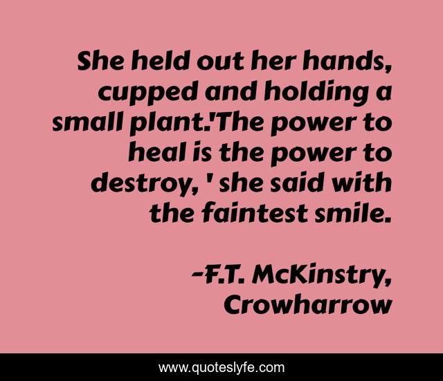 This page presents the quote "She held out her hands, cupped and holding a small plant.'The power to heal is the power to destroy, ' she said with the faintest smile.". Author of this quote is F.T. McKinstry, Crowharrow. This quote is about plants, herbalism, healing, power, destruction,.