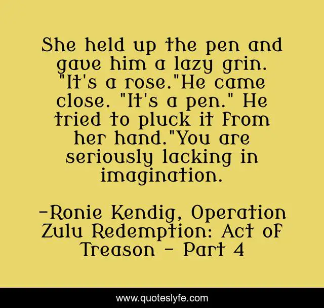 This page presents the quote "She held up the pen and gave him a lazy grin. "It's a rose."He came close. "It's a pen." He tried to pluck it from her hand."You are seriously lacking in imagination.". Author of this quote is Ronie Kendig, Operation Zulu Redemption: Act of Treason - Part 4. This quote is about humor, rose, imagination, pen, love, affection,.