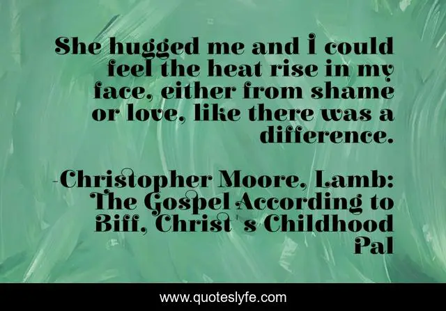 This page presents the quote "She hugged me and I could feel the heat rise in my face, either from shame or love, like there was a difference.". Author of this quote is Christopher Moore, Lamb: The Gospel According to Biff, Christ's Childhood Pal. This quote is about shame, love, 94, affection,.