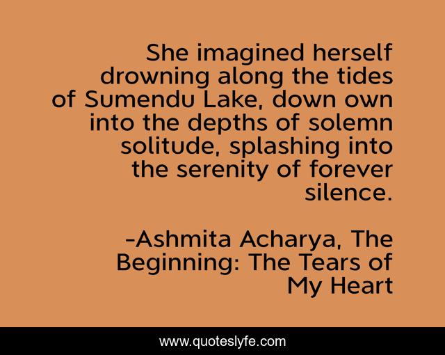 This page presents the quote "She imagined herself drowning along the tides of Sumendu Lake, down own into the depths of solemn solitude, splashing into the serenity of forever silence.". Author of this quote is Ashmita Acharya, The Beginning: The Tears of My Heart. This quote is about drowning, pain, sorrow, solitude, sadness, despair, silence, painful,.