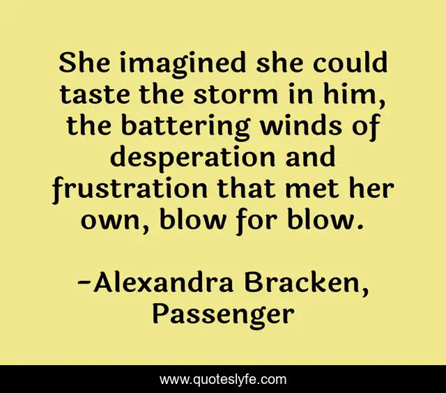 This page presents the quote "She imagined she could taste the storm in him, the battering winds of desperation and frustration that met her own, blow for blow.". Author of this quote is Alexandra Bracken, Passenger. This quote is about love-lust, passion, storm, stormy,.