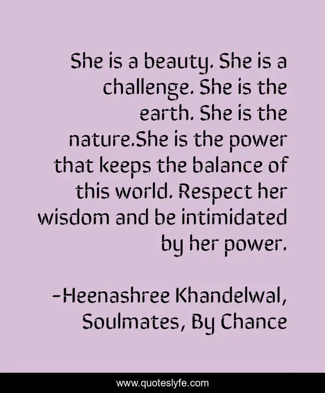 This page presents the quote "She is a beauty. She is a challenge. She is the earth. She is the nature.She is the power that keeps the balance of this world. Respect her wisdom and be intimidated by her power.". Author of this quote is Heenashree Khandelwal, Soulmates, By Chance. This quote is about woman-s-strength, respect, woman, womanhood,.