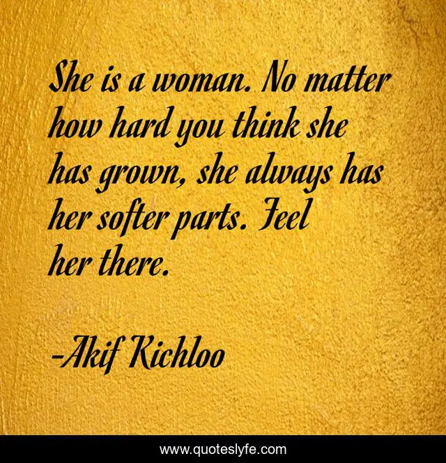 This page presents the quote "She is a woman. No matter how hard you think she has grown, she always has her softer parts. Feel her there.". Author of this quote is Akif Kichloo. This quote is about life, woman, love, affection,.