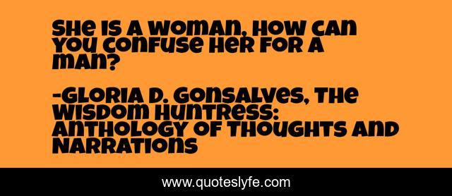 This page presents the quote "She is a woman, how can you confuse her for a man?". Author of this quote is Gloria D. Gonsalves, The Wisdom Huntress: Anthology of Thoughts and Narrations. This quote is about quote, quotes,.