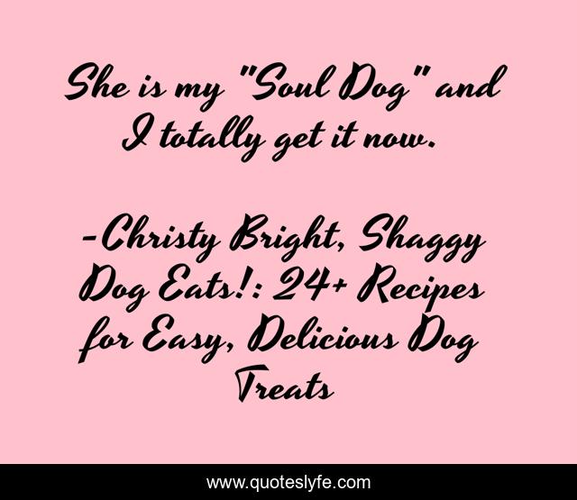 This page presents the quote "She is my "Soul Dog" and I totally get it now.". Author of this quote is Christy Bright, Shaggy Dog Eats!: 24+ Recipes for Easy, Delicious Dog Treats. This quote is about treats, dog-food, dogs, soul-mates, cookbook,.