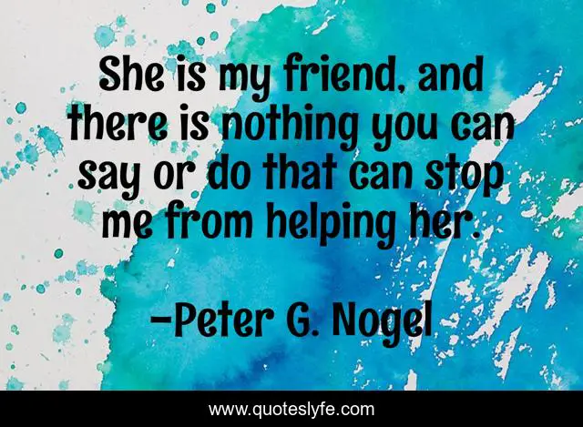This page presents the quote "She is my friend, and there is nothing you can say or do that can stop me from helping her.". Author of this quote is Peter G. Nogel. This quote is about relationships, historical-novel, mystery-series,.
