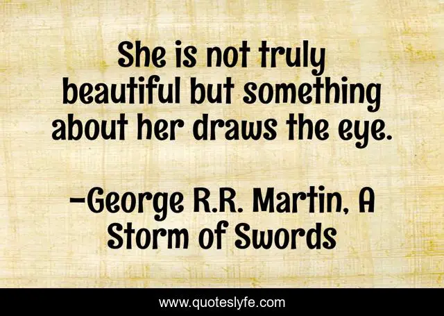 This page presents the quote "She is not truly beautiful but something about her draws the eye.". Author of this quote is George R.R. Martin, A Storm of Swords. This quote is about girl, attractive, beauty,.