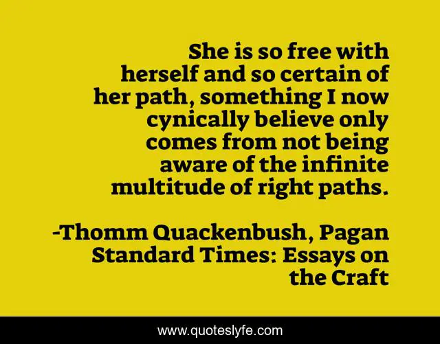 This page presents the quote "She is so free with herself and so certain of her path, something I now cynically believe only comes from not being aware of the infinite multitude of right paths.". Author of this quote is Thomm Quackenbush, Pagan Standard Times: Essays on the Craft. This quote is about path, free, cynic,.