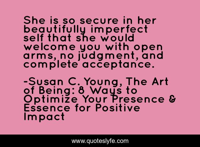 This page presents the quote "She is so secure in her beautifully imperfect self that she would welcome you with open arms, no judgment, and complete acceptance.". Author of this quote is Susan C. Young, The Art of Being: 8 Ways to Optimize Your Presence & Essence for Positive Impact. This quote is about social-networking, susan-young, relationship, communication-skills, communication, personality-development, first-impressions, authenticity, trust,.